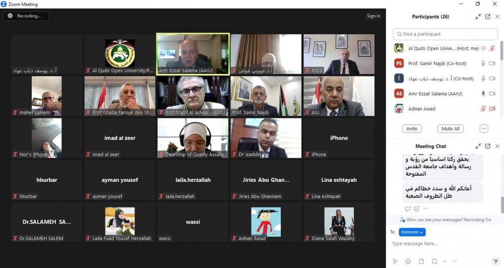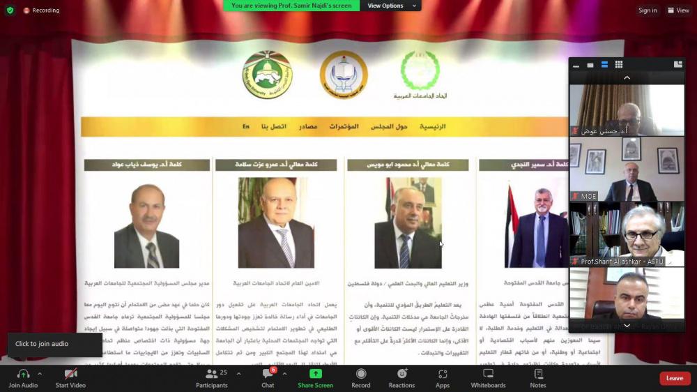 تحت رعاية الأمين العام للاتحاد العام للجامعات العربية معالي أ. د. عمرو عزت سلامة، وبحضور معالي وزير التعليم العالي والبحث العلمي أ. د. محمود أبو مويس، وباحتضان جامعة القدس المفتوحة، تم افتتاح مجلس المسؤولية المجتمعية للجامعات العربية وإطلاق الموقع الالكتروني الخاص به (csr.qou.edu)، وذلك الثلاثاء 24/10/2023 عبر منصة "زووم".