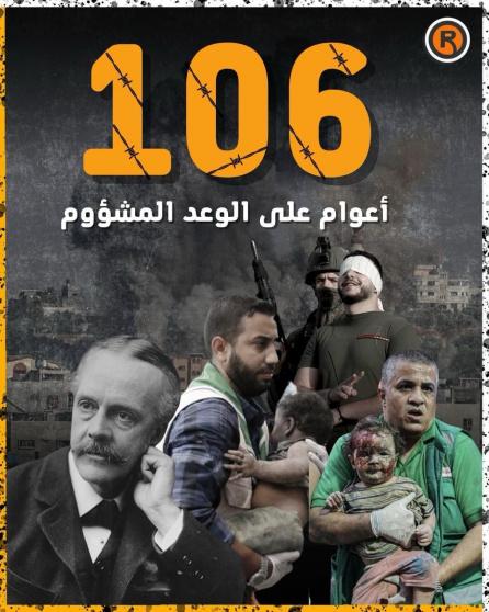وعد بلفور مازال يعمل حتى اليوم. فالجماعة التي لا تستحق تواصل يومياً القتل والفصل العنصري والإعتقال والمصادرة و الخنق على كامل الشعب الفلسطيني في كل مكان.