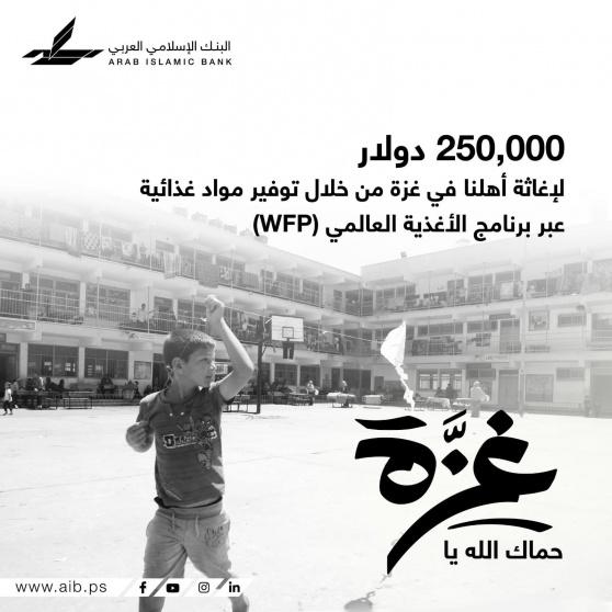 قدم البنك الإسلامي العربي إغاثة عاجلة لأهلنا في قطاع غزة بقيمة 250 ألف دولار لصالح توفير المواد الغذائية لأهلنا في قطاع غزة، وذلك استجابة للنداء الموجه عبر برنامج الأغذية العالمي التابع للأمم المتحدة (WFP).