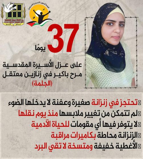 قالت هيئة الأسرى والمحررين، ونادي الأسير الفلسطينيّ، إنّ إدارة سجون الاحتلال تواصل عزل الأسيرة مرح باكير (24 عامًا) من القدس، منذ (37) يومًا في ظروف قاسية ومأساوية في زنازين معتقل (الجلمة)، وذلك بعد عملية قمع تعرضت لها الأسيرات في تاريخ السابع من أكتوبر في سجن (الدامون) حيث تقبع غالبية الأسيرات.