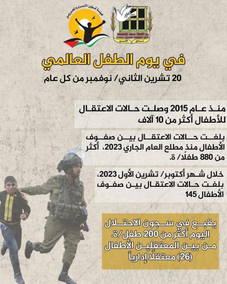 قالت هيئة شؤون الأسرى والمحررين ونادي الأسير الفلسطينيّ، في يوم الطفل العالميّ الذي يصادف الـ20 من تشرين الثاني/ نوفمبر من كل عام، إنّ الاحتلال الإسرائيليّ، وإلى جانب الإبادة المستمرة بحقّ شعبنا في غزة ومنهم الآلاف من الأطفال، فإنّ الاحتلال يواصل عمليات الاعتقال الممنهجة بحقّ الأطفال الفلسطينيين في الضّفة، والتي شكّلت وما تزال إحدى أبرز السّياسات الثّابتة والممنهجة، لاستهداف الأطفال والأجيال الفلسطينية.