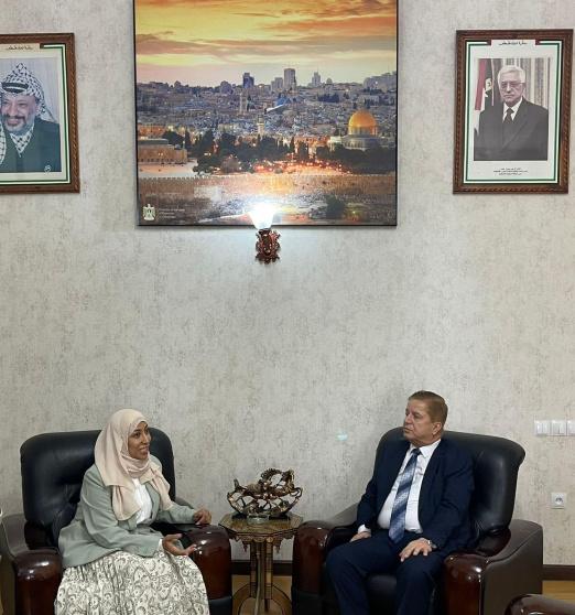 بدوره اطلع معالي د جواد عواد سعادة السفيرة على تطورات الاوضاع جراء الحرب والعدوان والحصار وعمليات القتل وهدم البيوت واستمرار المجازر ضد ابناء شعبنا في فلسطين كما تطرق الى جهود القيادة واتصالاتها منذ اليوم الاول للعدوان لالزام اسرائيل بوقف عدوانها وحربها وانهاء معاناة شعبنا المستمرة اكثر من 75 عاما