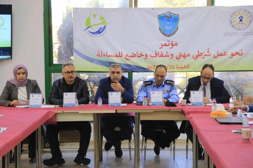 نظم مركز الاعلام وحقوق الانسان والديمقراطية " شمس " مؤتمراً تحت عنوان " نحو عمل شرطي مهني وشفاف وخاضع للمساءلة " بالتعاون مع مديرية الشرطة، وذلك في قاعة حديقة الحيوانات الوطنية بمدينة قلقيلية.