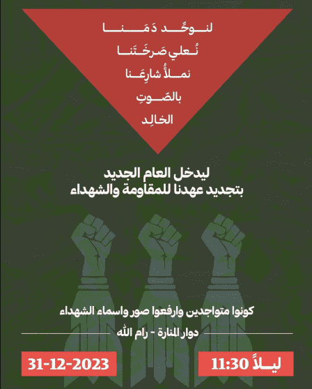 أمتنا العربية، أحرار العالم.. وأن مشاهد التنكيل والتجويع هي مشاهد يمكن إزاحتها، حتى تتمكن تكن يو ًما، وأن صور الموت قصفًا وحرقً الشاشات من بث العد التنازلي الستقبال العام الجديد. ليس لنا أن نحتفل وشالل الدّم ال يزال نازفا،ً ليس لنا أن نحتفل وحرب اإلبادة مستمرة، ليس لنا أن نحتفل وقطاعنا الحبيب يواجه القتل الوحشي والحصار القاتل، ليس لنا أن نحتفل ونحن نعيش الموت في كل يوم. لنتّحد في تنسيق التظاهرات في كل مدن العالم لدعم القضية الفلسطينية، يوم 31 كانون األول ،2023 في تمام الساعة 11:30 مسا ًء وحتى دخول العام الجديد. ولتكن شعاراتنا: ُمخلّدةً لل ّشهداء الذين ارتقوا ليصنعوا مجدنا، موحدةً لنا على خيار المقاومة وال ّصمود، من أجل وقف اإلبادة، ووقف اإلمدادات العسكرية للكيان ال ّصهيوني، ضاغطةً لسفارات مرتكبي اإلبادة ومطالبةً را بمحاسبة القتلة والمجرمين. فضةً ليستقبل العالم عامه الجديد هذه المرة بتجديد العهد لنصرة المقهورين والمستعَمرين، بتجديد العهد للنضال ضد قوى الظالم واالستعمار، وتجديد العهد للحفاظ على إنسانية وروح المقاوم ال ُحر التي تتحدى جنون كل من يحاول سحق اإلنسان.