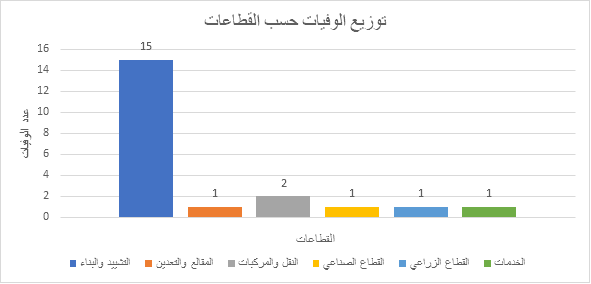 حيث شهد العام المنصرم، 21 وفاة مهنية، 15 منها في قطاع التشييد والبناء ولوحظ أنّ ثلث هذه الاصابات يعود سببه إلى السقوط من علوّ، ووفاة واحدة في القطاع الصناعي بسبب السقوط في بئر مصعد، وسجلت أيضاً وفاة في قطاع المقالع والتعدين بانقلاب جرافة، ووفاتان في قطاع النقل بسبب انقلاب شاحنة، ووفاة في قطاع الخدمات بسبب التكهرب ووفاة في القطاع الزراعي بسبب انقلاب جرار زراعي. ويعتبر عدد الوفيات لهذا العام أقل بنسبة 20% مُقارنة بالعام الماضي؛ حيث سجلت 26 وفاة مهنية.