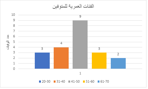 ومن ناحية أعمار المتوفين، فقد كان نطاق الأعمار ما بين 28-70 عاماً، ومن ناحية أخرى؛ فالنسبة الأعلى للوفيات سُجّلت لعمال الفئة العمرية 41-50 عاماً بواقع 9 حالات وفاة، أما حالات الوفاة الأدنى فهي للفئة العمرية من 61-70 بواقع وفاتان. وكما وسجلت 4 وفيات لعاملين في الفئة العمرية من 31-40 عاماً، و 3 وفيات في الفئتين 20-30 و51-60 على التوالي.
