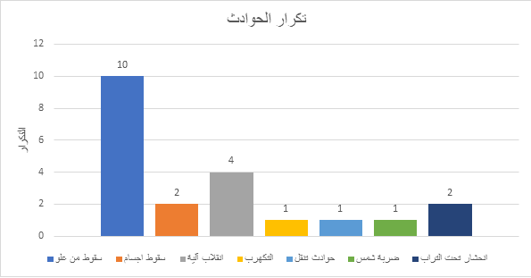 ومن ناحية تكرار الحوادث، وحسب الإحصائيات، فقد تكررت بعض الحوادث بنفس الطريقة والظروف، حيث سجلت 10 وفيات بسبب السقوط من علو 9 منها في القطاع الإنشائي وواحدة في القطاع الصناعي، ومن ناحية أخرى تكررت 4 وفيات بانقلاب آليات، وفاتان بسبب سقوط أجسام من علو ووفاتان بسبب انهيار التربة على العاملين أثناء القيام بأعمال حفريات. ودلالة تكرار وقوع الحوادث بنفس الطريقة هو عدم إجراء التحقيق الكافي والفعّال لاستخلاص الدروس والعبر لمنع الحدوث مرة أخرى؛ أو بمعنى آخر عدم التعلم من تكرار الحوادث المهنية Learning from Incidents ونشر نتائج التحقيق أولا بأول.