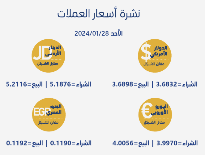 جاءت أسعار صرف العملات مقابل الشيقل الإسرائيلي، اليوم الاحد، بحسب سلطة النقد الفلسطينية، على النحو التالي: