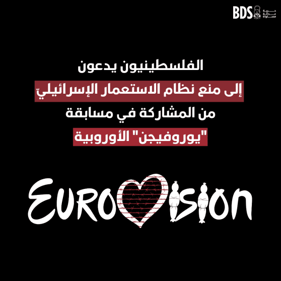 تدعو الحملة الفلسطينية للمقاطعة الأكاديمية والثقافية لإسرائيل (PACBI) ونقابة الصحفيين الفلسطينيين اتحاد البث الأوروبيّ (EBU) لمنع نظام الاستعمار الاستيطاني والأبارتهايد الإسرائيليّ من المشاركة في مسابقة الأغنية الأوروبية، "يوروفيجن"، أو مواجهة حملة مقاطعة واسعة النطاق.