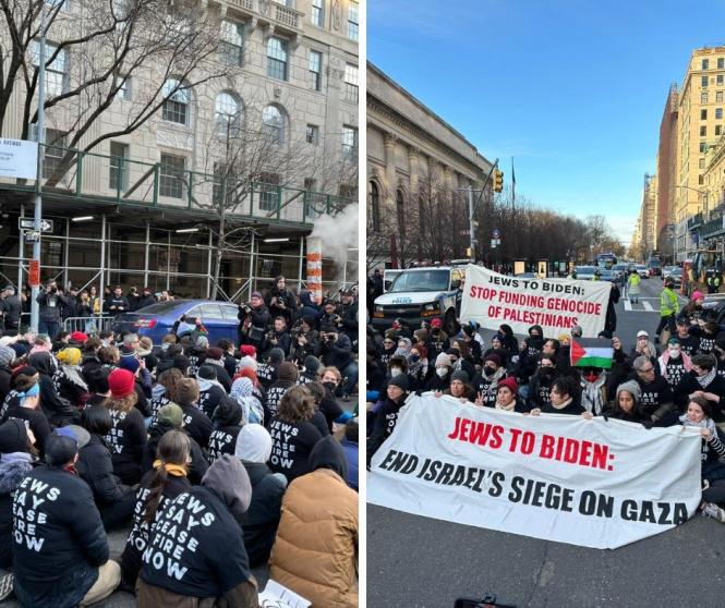 وطالب المتظاهرون بايدن في أول ظهور له، في حي مانهاتن الشهير، منذ بداية الحرب على قطاع غزة، بوقف تمويل الإبادة الجماعية التي ترتكبها إسرائيل بحق الفلسطينيين.