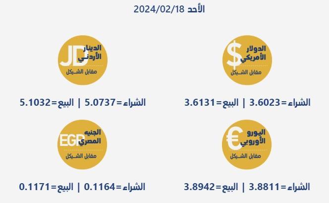 جاءت أسعار صرف العملات مقابل الشيقل الإسرائيلي، اليوم الأحد، بحسب سلطة النقد الفلسطينية، على النحو التالي: