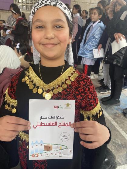 ورحبت تهاني بركات مديرة المدرسة بالحضور ودعت الطالبات الى الاستغناء عن المنتجات غير الفلسطينية على قاعدة منتج بلدي اولى، موضحة ان الطالبات بامكانهم أن يؤثرن على الاسرة والمحلات لتسويق وشراء المنتجات الفلسطينية.