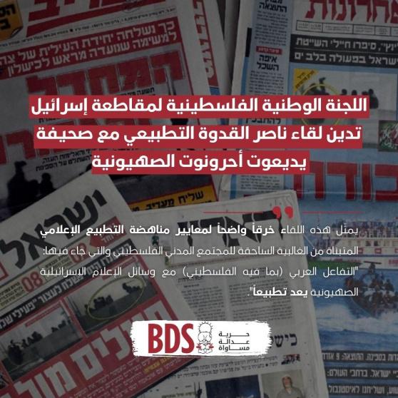 تدين اللجنة الوطنية الفلسطينية للمقاطعة، أوسع ائتلاف في المجتمع الفلسطيني، وقيادة حركة مقاطعة إسرائيل وسحب الاستثمارات منها وفرض العقوبات عليها (BDS)، اللقاء التطبيعي الذي عقده د. ناصر القدوة مع صحيفة يديعوت أحرونوت العبرية، إحدى أهم أدوات الدعاية الصهيونية التحريضية على شعبنا.
