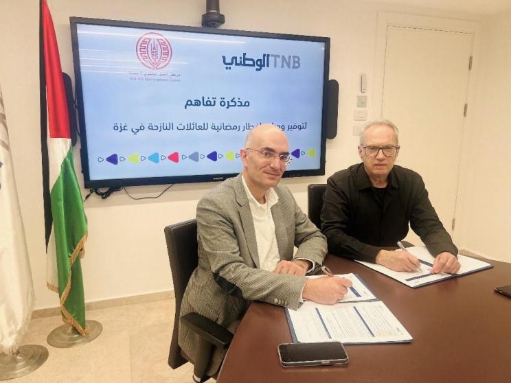 ضمن حملته لسلسة من التبرعات الإنسانية في غزة، وقع البنك الوطني اتفاقية مع مركز العمل التنموي-معا، والتي تتمثل بتوفير آلاف الوجبات الرمضانية الساخنة للعائلات النازحة في مراكز الايواء في محافظتي رفح والوسطى. وجاء هذا الإعلان ضمن مؤتمر صحفي عقده الطرفان في مقر البنك في مدينة رام الله.