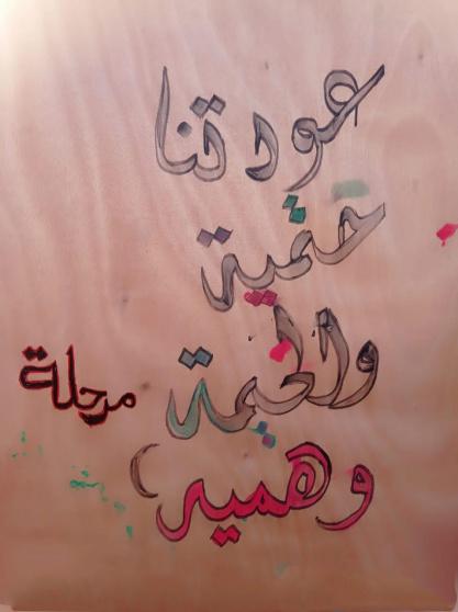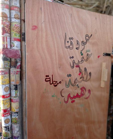 وعن الصعوبات، أشار إلى أنه "واجهتنا صعوبات مثل الإسمنت وهذا غير متوفر بالسوق، ووصلنا فكرة بأننا دمجنا اليوم بين الطبيعة والواقع اللي نحنا فيه، اليوم سما وأرض وعنا بحر، فدمجنا الزلف البحري والرمل، وحاولنا أن نعبر عبر اللافتات بكلمات عن الحرب وفلسطين والنزوح وعلقناها على الخيمة".