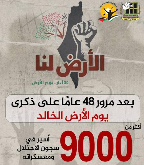 وفي ذكرى يوم الأرض، قالت هيئة شؤون الأسرى والمحررين ونادي الأسير الفلسطيني في بيان مشترك، أن أعداد الأسرى في سجون الاحتلال الإسرائيليّ تضاعفت بعد السابع من أكتوبر، ليصل لأكثر من (9000) أسير، وهذا المعطى لا يشمل كافة المعتقلين من غزة الذي يواصل الاحتلال تنفيذ جريمة الإخفاء القسري بحقهم.