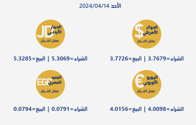 حسب بيانات صادرة عن سلطة النقد الفلسطينية، فإن أسعار صرف العملات مقابل الشيقل الإسرائيلي اليوم، الأحد، هي كما يلي: