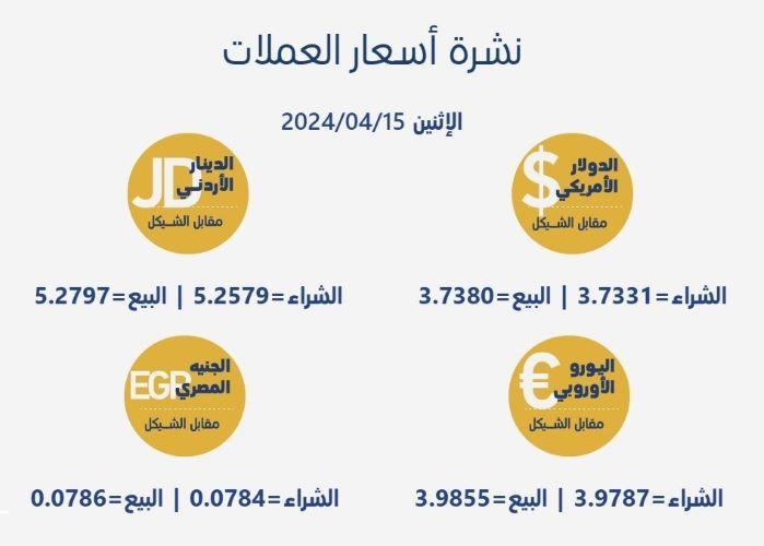 جاءت أسعار صرف العملات مقابل الشيقل الإسرائيلي، اليوم الإثنين، بحسب سلطة النقد الفلسطينية، على النحو التالي:
