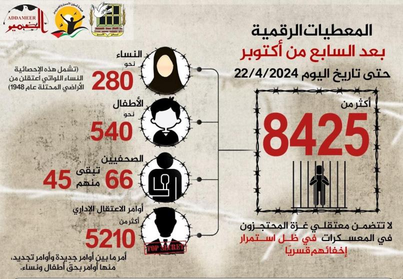 وبلغ عدد المعتقلين في سجون الاحتلال حتى نهاية شهر آذار/ مارس، أكثر من (9500)، من بينهم أكثر من (3660) معتقلا إداريا، و(849) صُنفوا (كمقاتلين غير شرعيين) من معتقلي غزة، وهذا الرقم المتوفر فقط كمعطى واضح من إدارة سجون الاحتلال الإسرائيلي.
