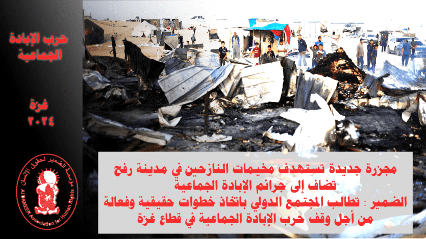 مؤسسة الضمير لحقوق الانسان – غزة، تابعت المجزرة الجديدة التي ارتكبتها قوات الاحتلال باستهداف مناطق وخيام النازحين في مدينة رفح جنوب قطاع غزة، ما أسفر عن استشهاد وإصابة العشرات من الفلسطينيين، في ظل عدم امتثال دولة الاحتلال لقرار محكمة العدل الدولية قبل أيام بوقف العمليات العسكرية في مدينة رفح.
