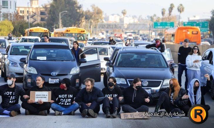 أغلق العشرات من المتظاهرين المتضامنين مع الشعب الفلسطيني لفترة وجيزة الطريق السريع 101 في وسط مدينة لوس أنجلوس في ولاية كاليفورنيا بعد ظهر يوم أمس .