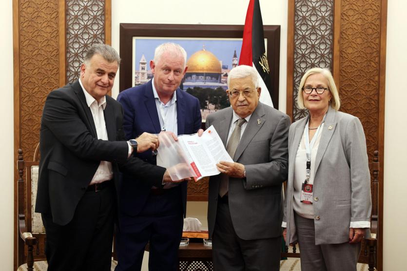 استقبل رئيس دولة فلسطين محمود عباس، مساء اليوم الأربعاء، بمقر الرئاسة في مدينة رام الله، وفدا تضامنيا نقابيا دوليا يضم الأمناء العامين للاتحادات المهنية في العالم، الذين يمثلون أكثر من 270 مليون نقابي، برئاسة رئيس الاتحاد الدولي لنقابات العمال لوك تريانغل.