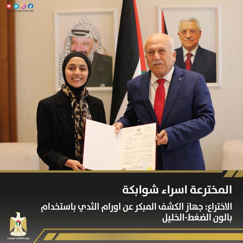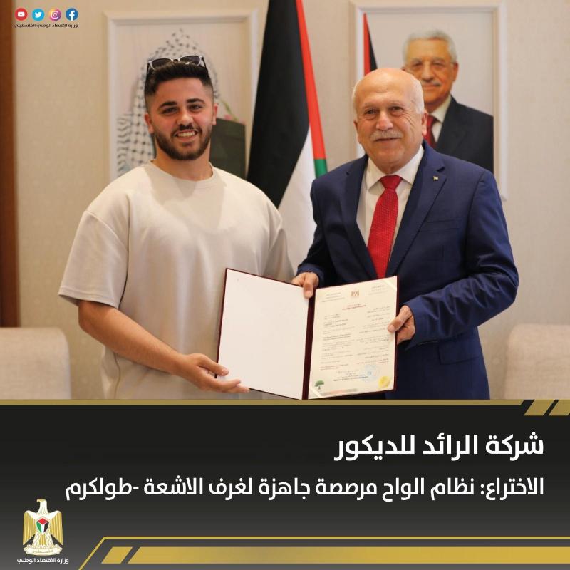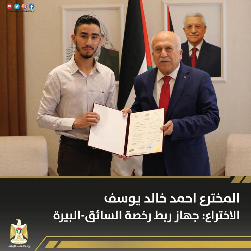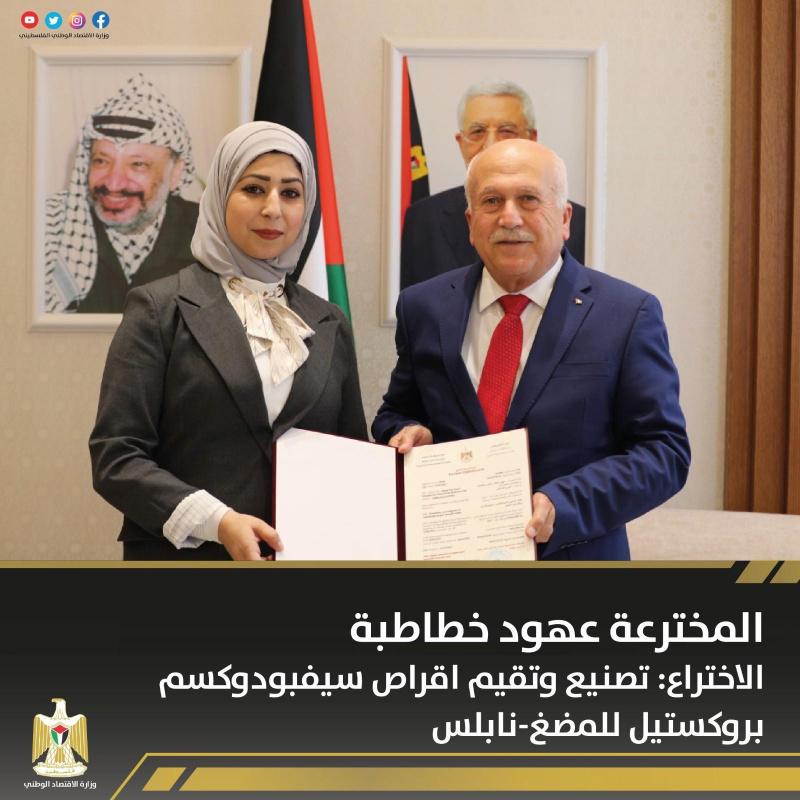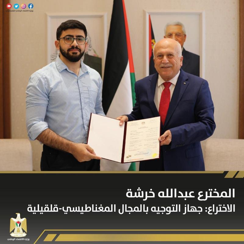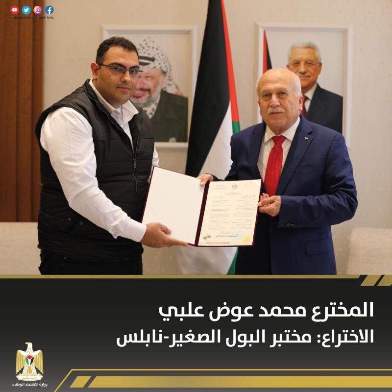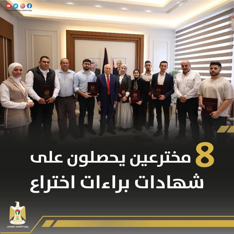 سلم وزير الاقتصاد الوطني محمد العامور 8 مبتكرين براءات اختراع في المجالات الطبية والتكنولوجية، وبذلك يرتفع عدد براءات الاختراع المسجلة في فلسطين إلى 104 براءة اختراع.