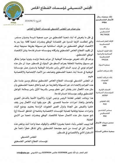 واكد المجلس التنسيقي لمؤسسات القطاع الخاص الفلسطيني استنكاره وادانته بشدة مثل هذه الجرائم والإعتداءات غير المسبوقة والخارجة عن قيم وأخلاق شعبنا الفلسطيني مشيرا الى أن مثل هذه الأفعال تنذر بفلتان أمني خطير ويمس بالدرجة الأولى بأمن وسلامة المواطن الفلسطيني ويكبد مؤسساتنا خسائر فادحة.