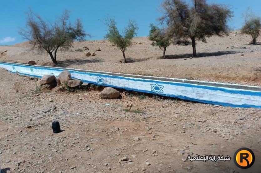 رسم مستوطنون، اليوم الثلاثاء، علم دولة الاحتلال الإسرائيلي على مجرى مياه نبع العوجا شمال مدينة أريحا.