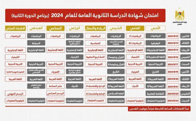 أعلنت وزارة التربية والتعليم العالي، اليوم الخميس، برنامج الدورة الثانية لامتحانات الثانوية العامة، كما يلي: