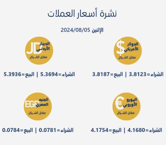جاءت أسعار صرف العملات مقابل الشيقل، اليوم الإثنين، بحسب سلطة النقد الفلسطينية، على النحو التالي: