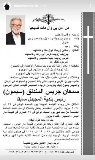 وستقام جنازة الراحل سيمون المندلق، الساعة 5 من بعد ظه1ر يوم السبت 17 أغسطس في كنيسة مار الياس المجيدل قضاء جزين في لبنان.