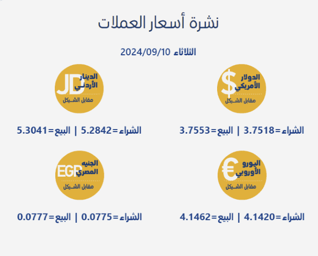 قابل الشيقل، اليوم الثلاثاء، بحسب سلطة النقد الفلسطينية، على النحو التالي: