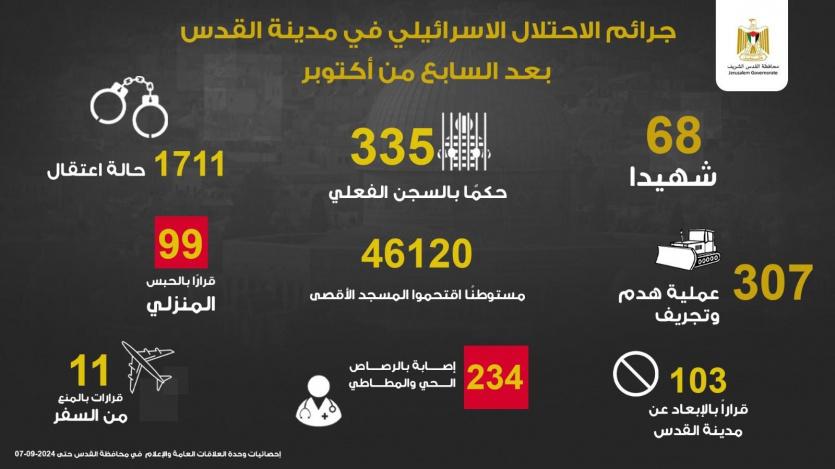 محافظة القدس: 68 شهيدا و1711 معتقلا و46293 مستوطنا اقتحموا "الأقصى"