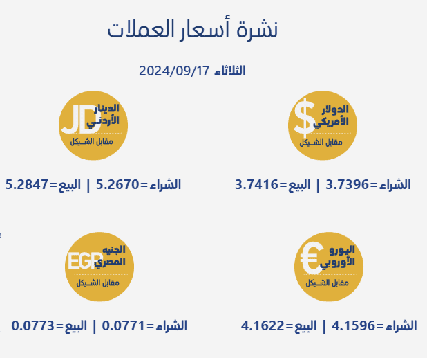 جاءت أسعار صرف العملات مقابل الشيقل، اليوم الثلاثاء، بحسب سلطة النقد الفلسطينية، على النحو التالي: