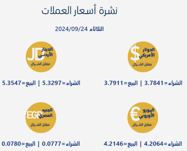 مقابل الشيقل، اليوم الثلاثاء، بحسب سلطة النقد الفلسطينية، على النحو التالي:
