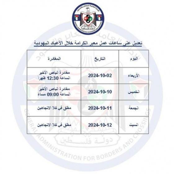 أعلنت الإدارة العامة للمعابر والحدود، إجراء تعديل على ساعات عمل معبر الكرامة، خلال شهر تشرين الأول المقبل، وذلك بسبب الأعياد اليهودية.