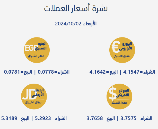 جاءت أسعار صرف العملات مقابل الشيقل الإسرائيلي، اليوم الأربعاء، بحسب سلطة النقد الفلسطينية، على النحو التالي: