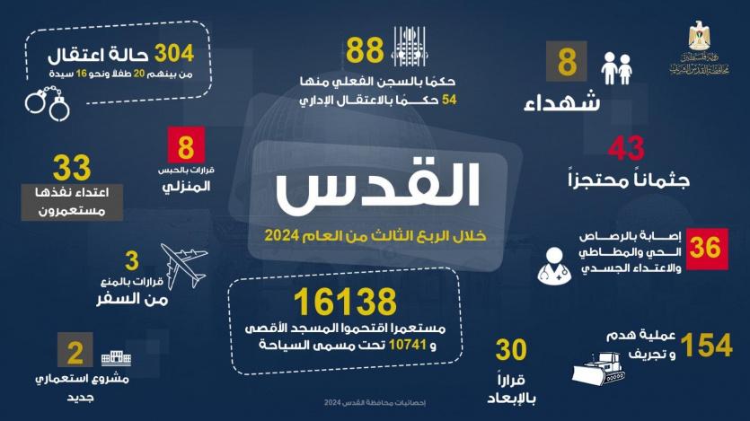 خلال الربع الثالث من عام 2024، تم رصد نحو (304) حالات اعتقال في مناطق محافظة القدس كافة، من بينها (20) طفلا و(16) امرأة.