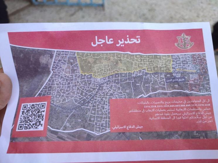 وألقى جيش الاحتلال مناشير تحذيرية للسكان المتواجدين في البلوكات التالية: 660, 664-666, 2210, 2220, 2221, 2314-2316, 2322، وتطالبهم بالإخلاء الفوري، والتوجه إلى ما يُسمّى بـ "المنطقة الإنسانية".