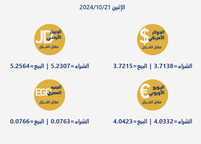جاءت أسعار صرف العملات مقابل الشيقل الإسرائيلي، اليوم الإثنين، بحسب سلطة النقد الفلسطينية، على النحو التالي: