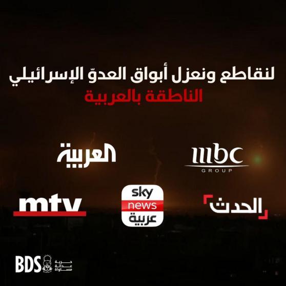 وإذ تحيّي اللجنة الوطنية الفلسطينية لمقاطعة إسرائيل، أوسع تحالف في المجتمع المدني الفلسطيني وقيادة حركة المقاطعة (BDS)، الاستجابة السريعة لشعوب المنطقة ودعوات مقاطعة المجموعة ومحاسبتها، خاصةً في العراق الشقيق، وتحيّي أيضاً الصحفيين/ات الذين بدأوا الانسحاب والاستقالة من بعض هذه الفضائيات، فإنّها تدعو إلى مقاطعة كافة أبواق العدو الإسرائيلي الناطقة باللغة العربية، مثل "مجموعة MBC" والتي تشمل فضائيتي "العربية" و"الحدث"، و"سكاي نيوز عربية" و(MTV) اللبنانية، بالإضافة إلى بعض الصحف الصفراء المموّلة من جهات مقرّبة من النظامين السعودي والإماراتي الاستبداديين، مثل "الشرق الأوسط"، وذلك لمساهمة كل منها في تبرير المجازر الإبادية ضد شعبنا والشعب اللبناني الشقيق، والدفاع عن المنطق الاستعماري الإسرائيلي، فضلاً عن تبنّي الرواية الصهيونية إلى حدّ المساهمة في التحريض والتضليل والحرب النفسية ضد شعوبنا ومقاومتنا للاضطهاد.