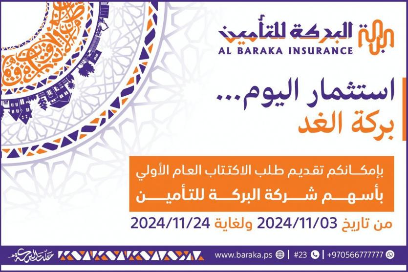 أعلنت شركة البركة للتأمين الإسلامي المساهمة العامة عن طرح أسهمها للاكتتاب العام الأولي، بعد حصولها على الموافقة من هيئة سوق رأس المال الفلسطينية في 17 تشرين أول الماضي، وبلغ عدد الأسهم المقرر طرحها في الاكتتاب 2,250,000 سهماً بسعر 1 دولار أمريكي للسهم والواحد، وتمثل نسبة الأسهم المطروحة 37.5% من رأس المال المصرح به والذي يبلغ 6,000,000 دولار أمريكي، وستستمر فترة الاكتتاب لمدة 23 يوم من صباح اليوم الأحد 3 تشرين ثاني ولغاية مساء يوم الأحد 24 تشرين ثاني من العام 2024.