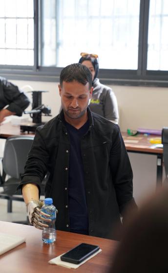 الشاب رافي ثوابته من عزموط قضاء نابلس وهو اول شخص قام بتجربة اليد الالكترونية، وأعرب عن سعادته لهذه التجربة، وينتظر الوقت لتركيبها بالشكل النهائي للاستمرار في حياته، موجها الشكر للجامعة العربية الامريكية ولمصنع الأطراف الصناعية في الجامعة على ما يقدموه من اجل خدمة المجتمع المحلي.