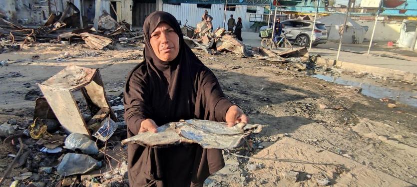 "رايــة" قابلت العم أبو محمد وزوجته، على أنقاض الخيمة المحروقة، حيث تجمع عدد من الجيران النازحين حولهما وهما يلتقطان بقايا العفش المُحترق، علها تشكل حجر الأساس لإعادة الحياة للمكان.