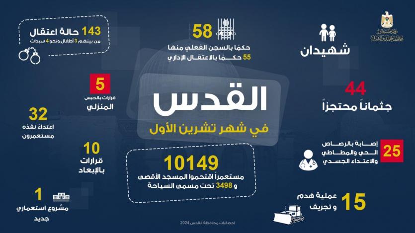 قالت محافظة القدس، في تقريرها الشهري حول جرائم الاحتلال الإسرائيلي في القدس، إن مواطنين استُشهدا واعتُقل 143 آخرون، خلال شهر تشرين الأول/ أكتوبر 2024.