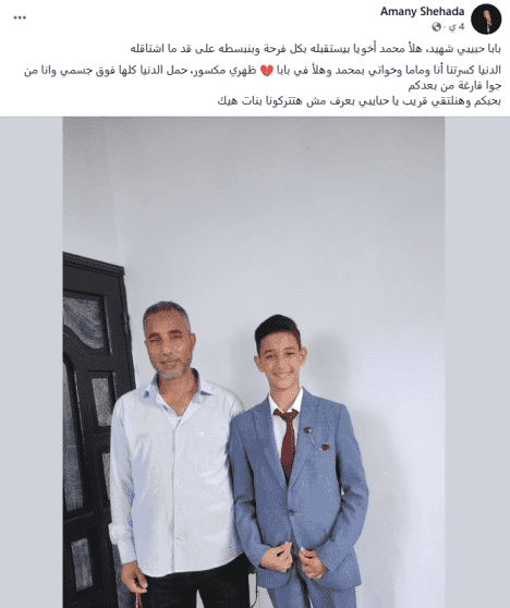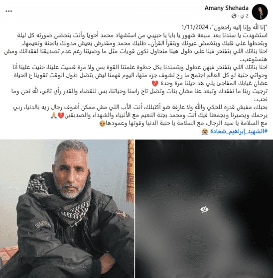 وأيضا واصلت "أماني" رثاء والدها، وكتبت: "استشهدت يا سندنا يا بابا يا حبيبي، بعد سبعة أشهر من استشهاد محمد أخويا، وأنت بتحضن صورته كل ليلة وبتحطها على قلبك وبتغمض عيونك وبتقرأ القرآن.. طلبك محمد ومقدرش يعيش مدونك بالجنة ونعيمها.."