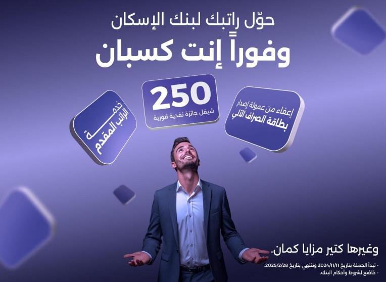 وتقدم حملة " حول راتبك لبنك الإسكان وفوراً انت كسبان" جائزة نقدية فورية بقيمة 250 شيقل لكل عميل يحول راتبه لبنك الاسكان، بالإضافة الى مجموعة من المزايا التمويلية أهمها إمكانية الحصول على خدمة الراتب المقدم، اعفاء من عمولة اصدار بطاقة الصراف الالي للسنة الأولى، اعفاء من عمولة اصدار بطاقه visa الائتمانية، بالإضافة الى امكانية شراء/ منح قروضاً بناءً على وضع العميل الائتماني، وغيرها العديد من المميزات، وذلك ابتداءً من 11/11/2024 وحتى 28/02/2025.