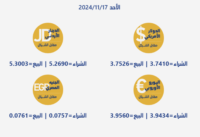 جاءت أسعار صرف العملات مقابل الشيقل الإسرائيلي، اليوم الأحد، بحسب سلطة النقد الفلسطينية، على النحو التالي: