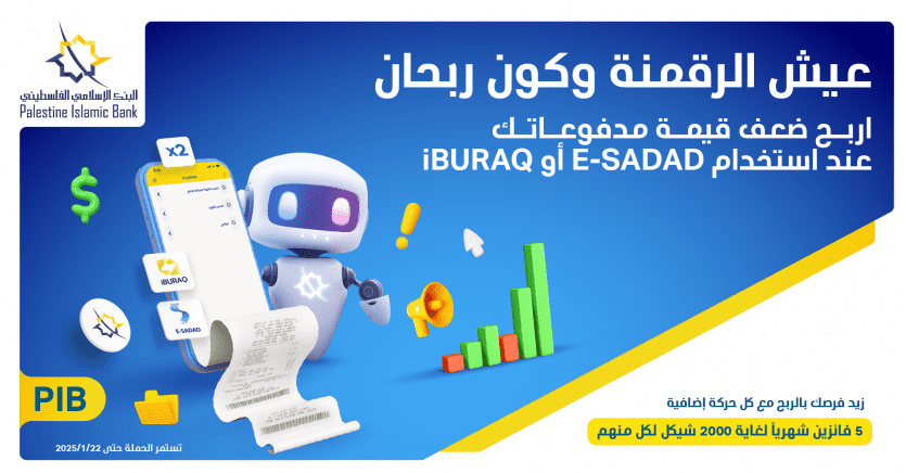 أطلق البنك الإسلامي الفلسطيني حملة " عيش الرقمنة وكون ربحان " لتشجيع الدفع الإلكتروني من خلال خدمتي E-SADAD و iBURAQ عبر تطبيق إسلامي موبايل.